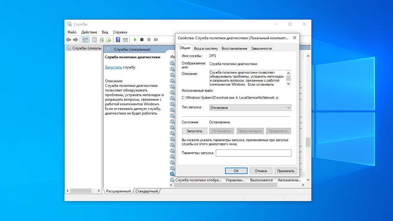 3. Отключите службу в «Типе запуска» и подтвердите изменения.