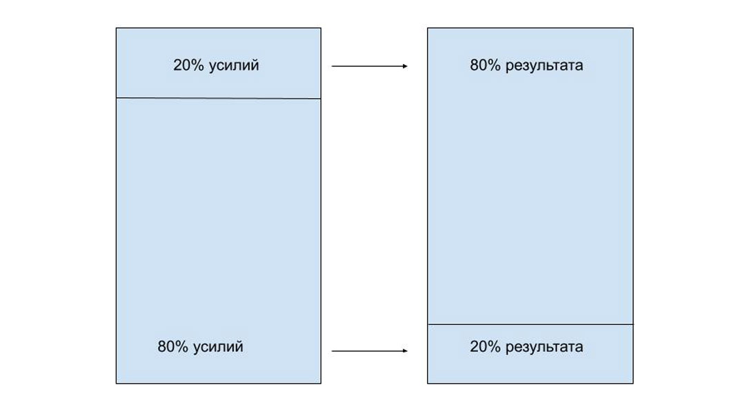Не стоит воспринимать принцип Парето слишком буквально — пропорция скорее условная. Но суть передана верно: чтобы получить максимальный результат, нам нужно сфокусироваться на минимуме самых эффективных решений.