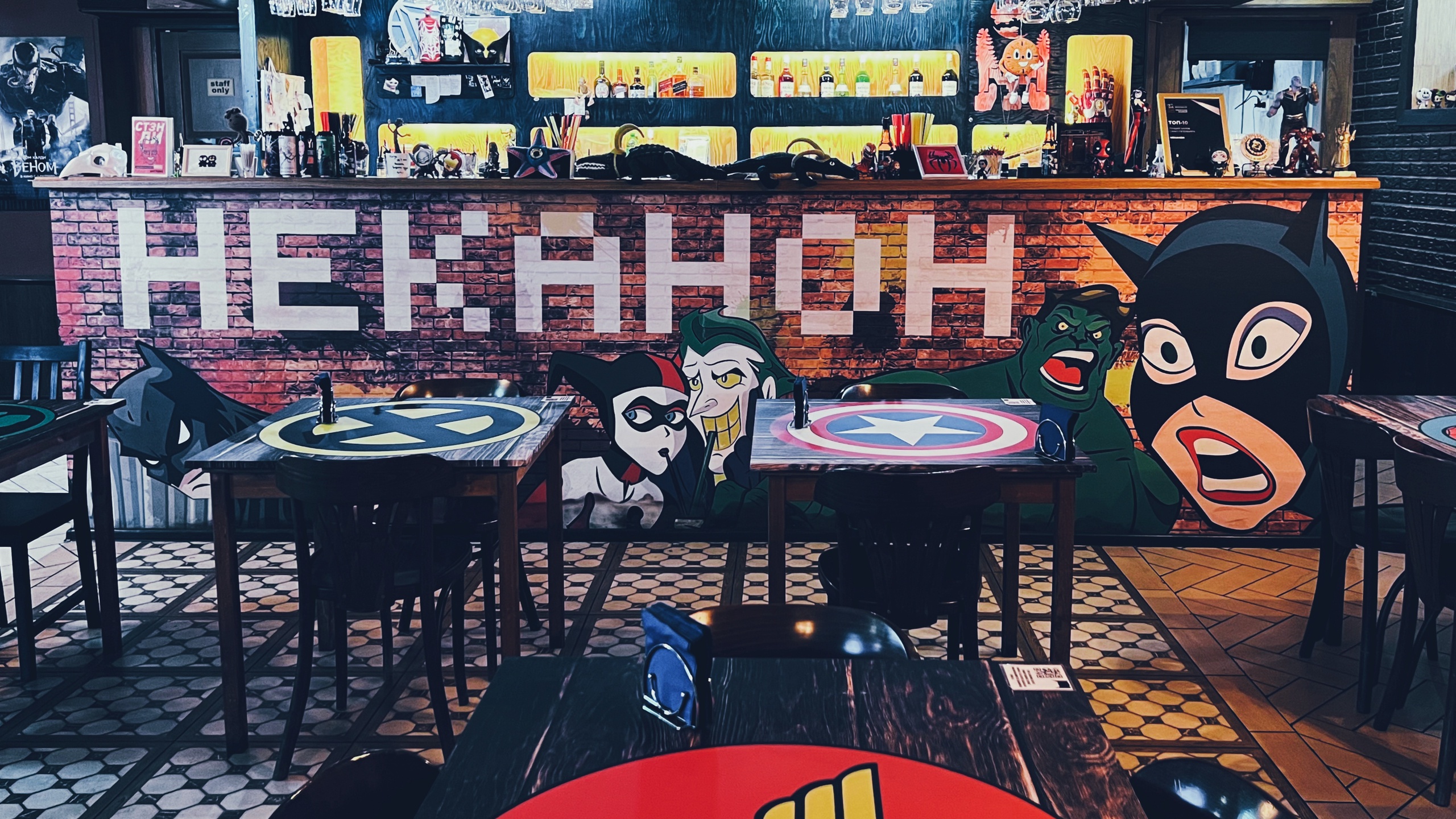 В основу концепции бара легли фильмы из киновселенных Marvel и DC, «Звёздных войн» и «Гарри Поттера». В интерьере использовано множество фанатской атрибутики. На кирпичных стенах развешаны плакаты с Капитаном Америкой, Тором, Железным человеком, Бэтменом, Дедпулом, изображение мастера Йоды, постеры к фильмам. На барной стойке красуются граффити с Халком и Женщиной-кошкой. Повсюду расставлены фигурки персонажей и копии принадлежащих им оружия и артефактов. Например, здесь есть знаменитый молот Тора, щит Капитана Америки, очки Гарри Поттера и целая коллекция бумерангов Бэтмена ― бэтарангов. Наклейки с героями также украшают каждый столик.