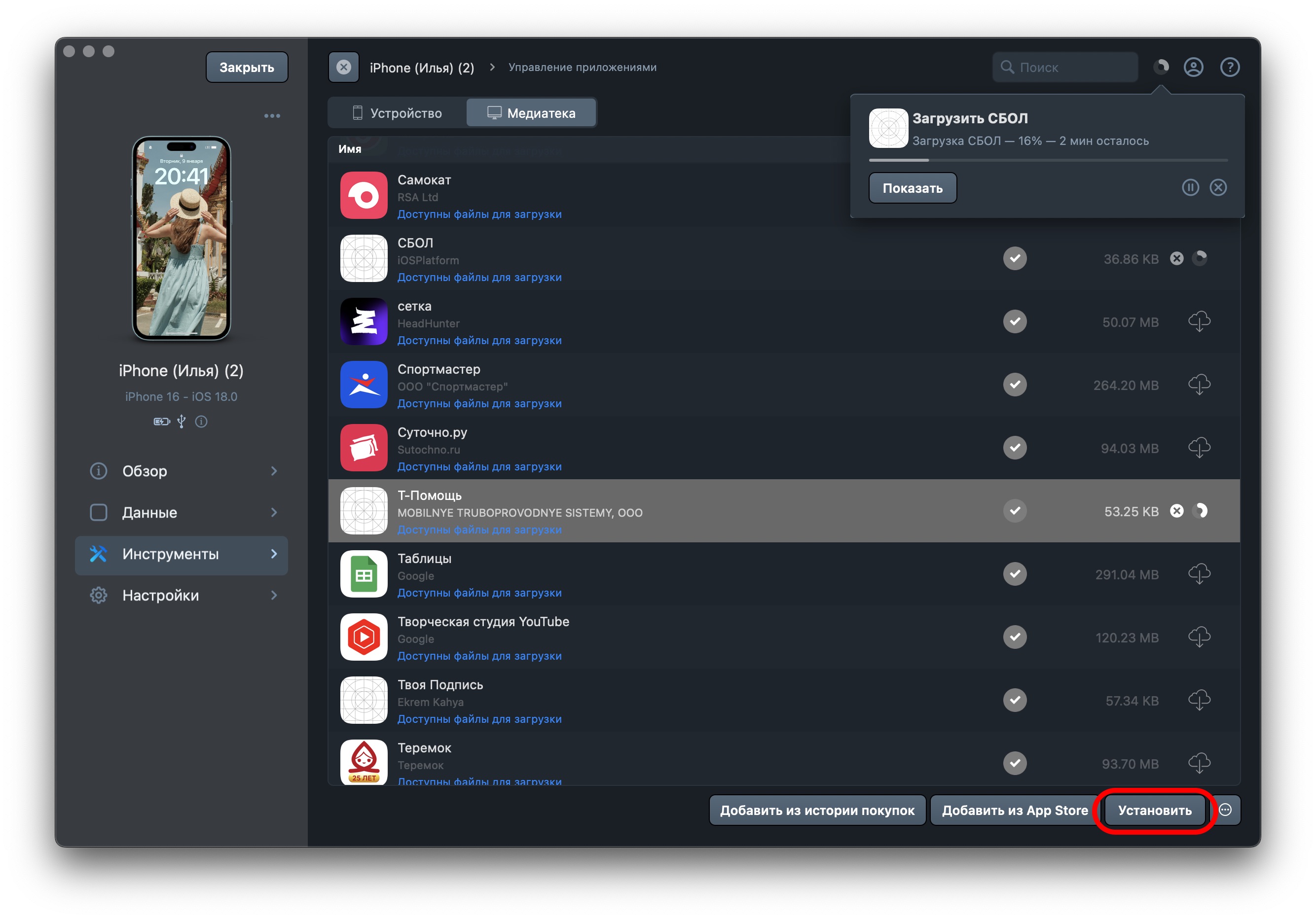 После этого все нужные приложения начнут скачиваться. Потом нажимайте на кнопку «Установить»: