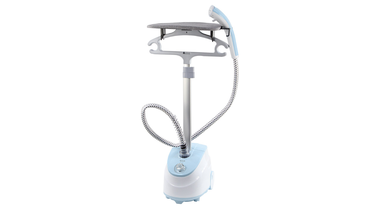 Объёмная конструкция напоминает пылесос, на котором расположена штанга с плечиками. В корпус встроен нагревательный элемент с ёмкостью для воды, а на конце шланга — рукоятка с отпаривающей подошвой.