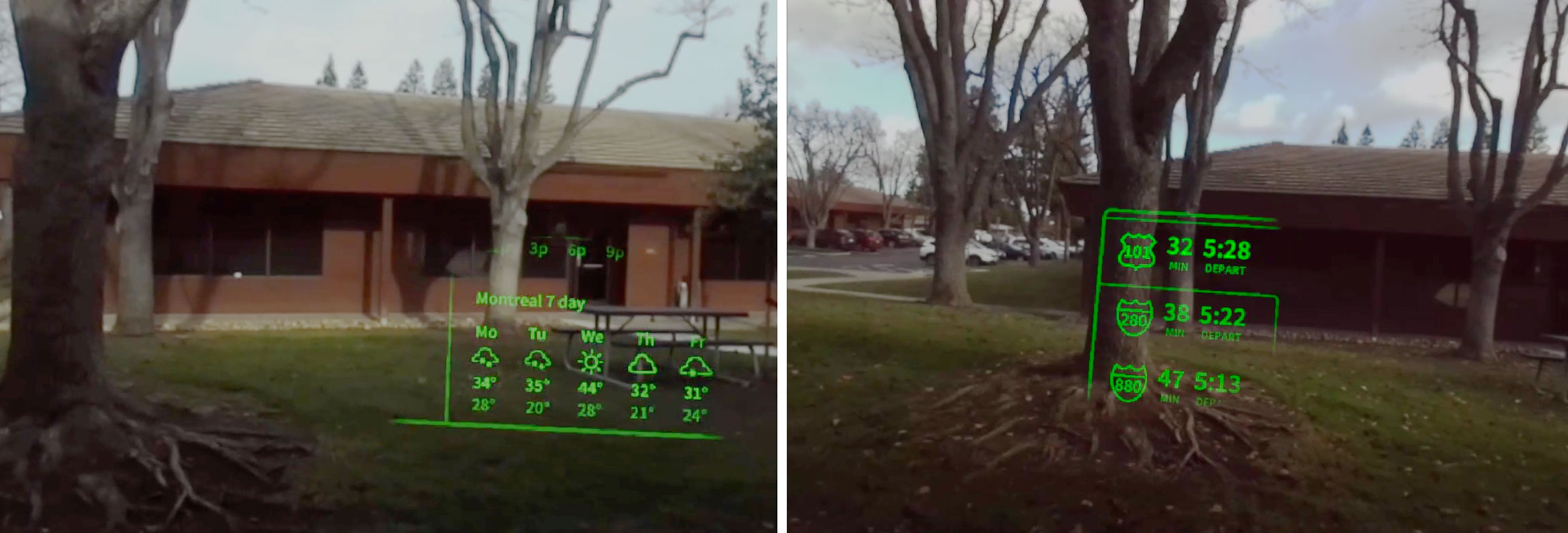 Я смотрю прямо перед собой, занимаясь своими повседневными делами. Вдруг я решаю проверить трафик до дома. Даже не замедляя шаг или не доставая смартфон, я выискиваю глазами маленькую зелёную точку, плавающую передо мной. Когда я смотрю на неё, она расширяется во всплывающее окно с небольшим, легко усваиваемым списком маршрутов до дома и продолжительностью каждого из них. Я могу заставить эту информацию исчезнуть, просто отведя взгляд. Даже не нужно поворачивать голову.