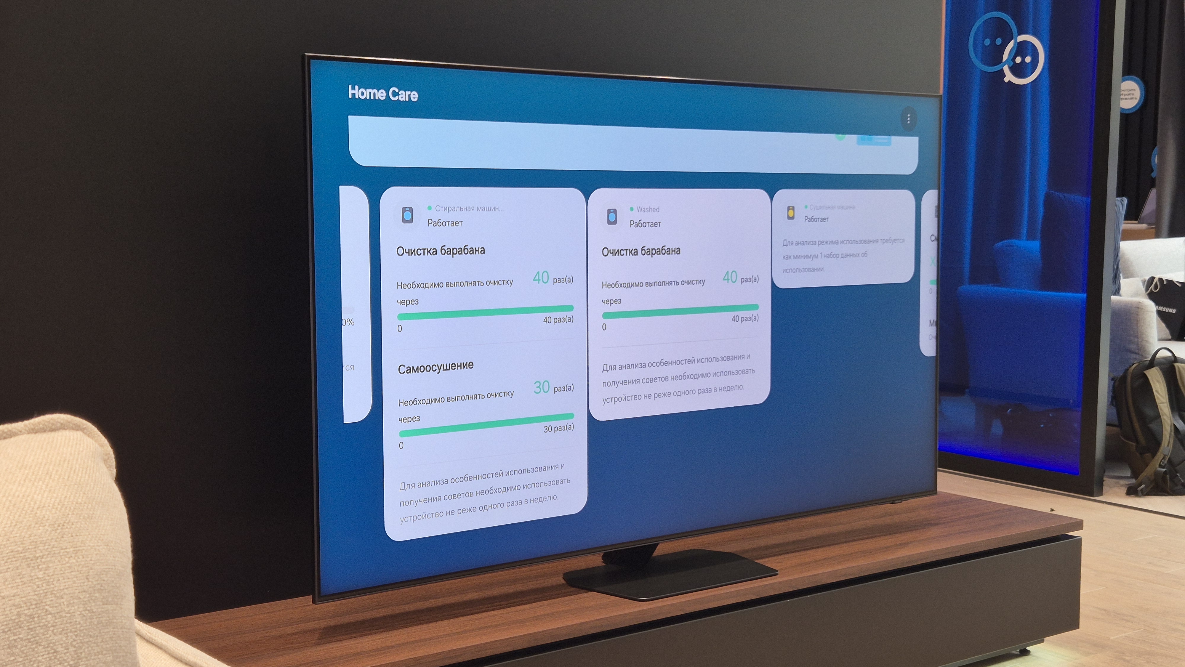 Новые телевизоры, по задумке производителя, должны выполнять роль центрального хаба для управления умным домом. Основной ориентир — плотная интеграция всех устройств Samsung в единую экосистему. Она называется SmartThings: с помощью телевизора можно проконтролировать работу стиральной машины, узнать уровень заряда робота-пылесоса, изучить 3D-карту вашей квартиры, а также получать уведомления от приложений. Вся информация о работе бытовой техники собирается на отдельном экране HomeCare и не мешает просмотру контента.