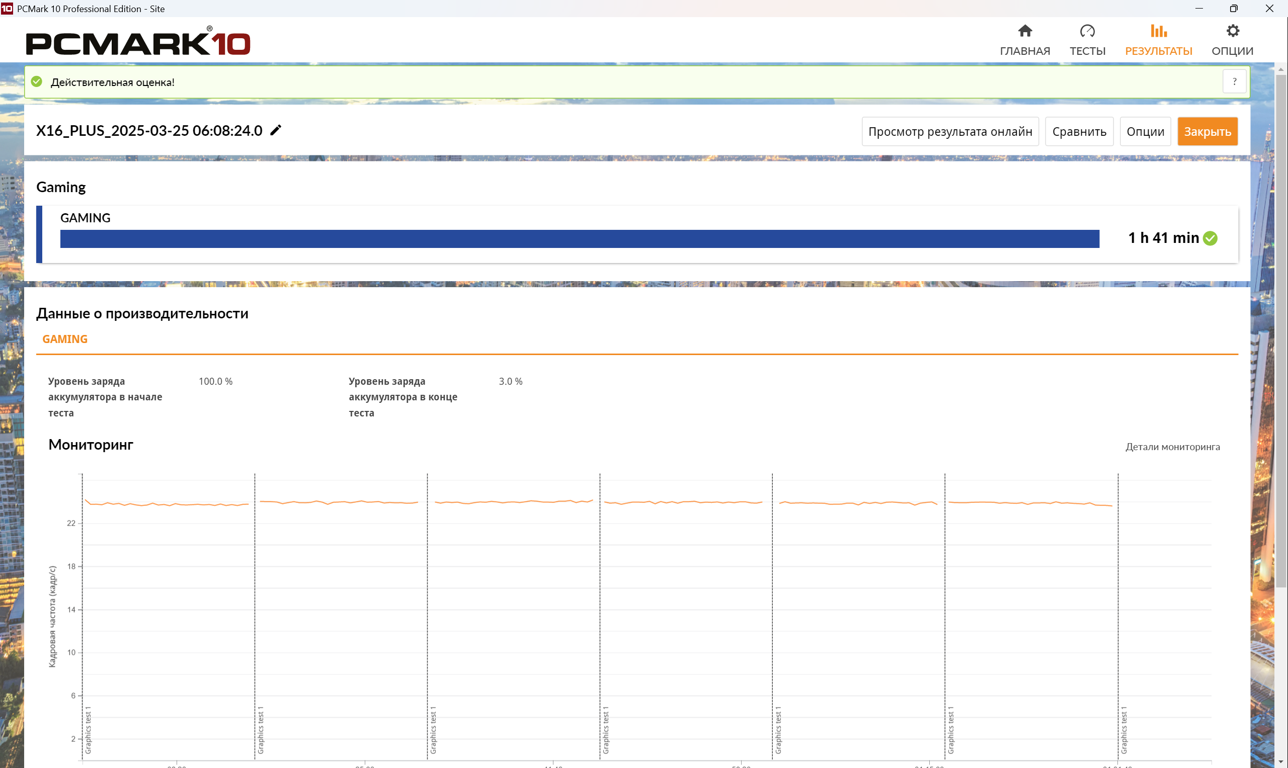 О ненужности OLED-дисплеев я вспомнил ещё и потому, что, оказывается, с ярким IPS-дисплеем 120 Гц большой 16” ноут способен работать 10 часов на максимальной яркости (просмотр видео) или 8-9 часов в режиме «браузер-музыка-видео-переписка». Офигенно, конечно – не впервые такое вижу – подобные трюки в более дешёвом сегменте показывает Tecno Megabook, в которые тоже лепят 75 Вт*ч – но тут-то дисплей заметно более яркий. А значит, и прожорливый? Но нет.